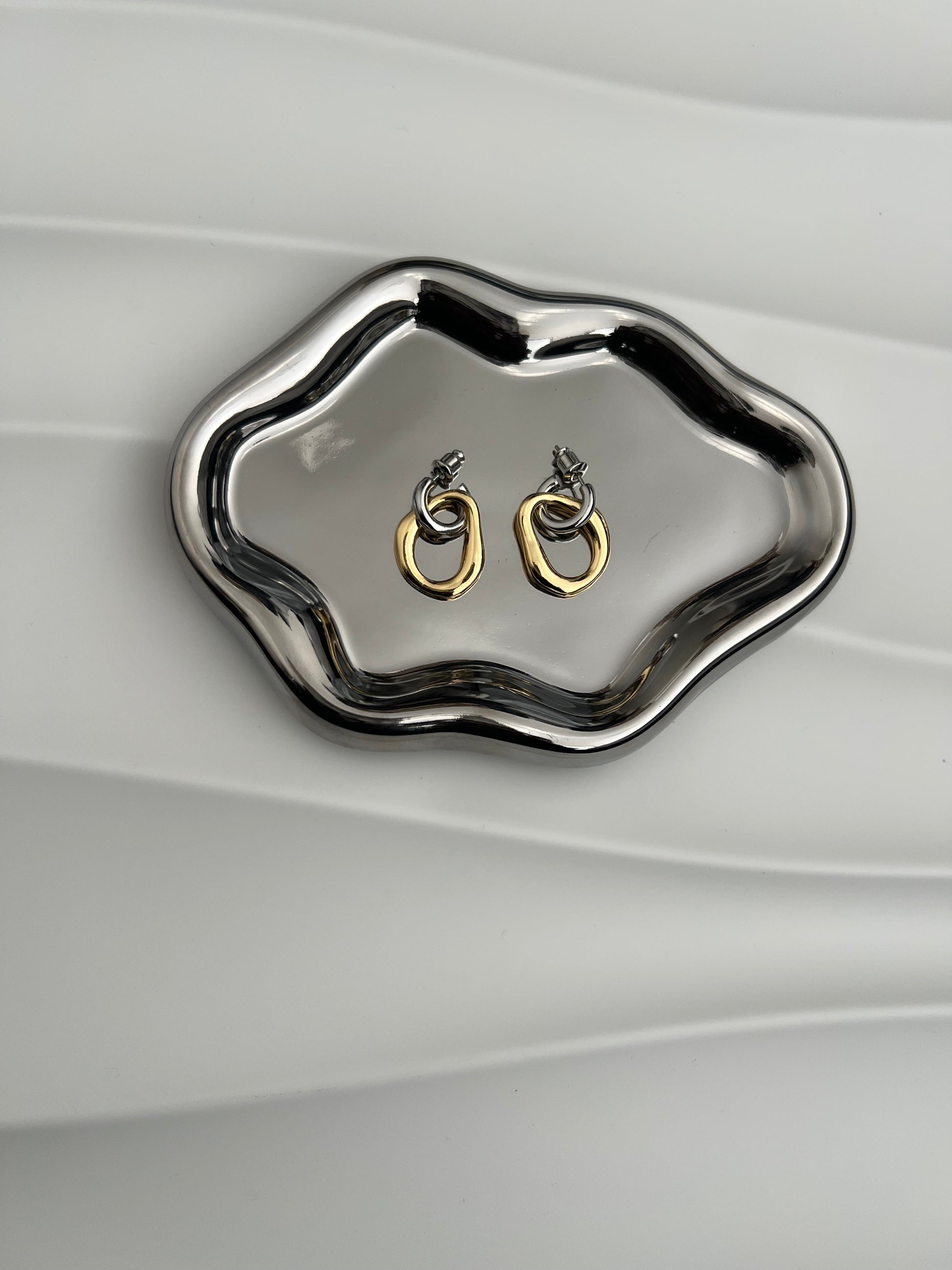 A balance of bold form, contrast and delicate shine — perfect for day-to-night styling, these 18K gold plated stainless steel earrings feature a two tone, double hoop. Pair with our cuffs or alone as a statement piece!